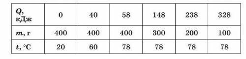 при нагревании и последующем кипении жидкости массой 400 г измеряли массу оставшейся в сосуде жидкости, её темп. и кол-во теплоты, сообщ. в жидкости. Данные представлены в виде таблицы. Считая, что потеря энергии можно пребречь, определите удельную теплоёмкость парообразования жидкости