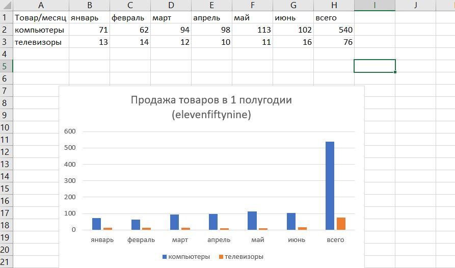 5. Чтобы заполнить столбец "всего", нужно построчно найти сумму значений для каждого товара формулой СУММ. Для компьютеров - "=СУММ(B2:G2)", для телевизоров - "=СУММ(B3:G3)". Для того, чтобы построить диаграмму, нужно выделить мышкой диапазон нужных значений (в данном случае с A1 по H3) и перейти в раздел "Вставка - Диаграммы". Получится примерно, как у меня.
