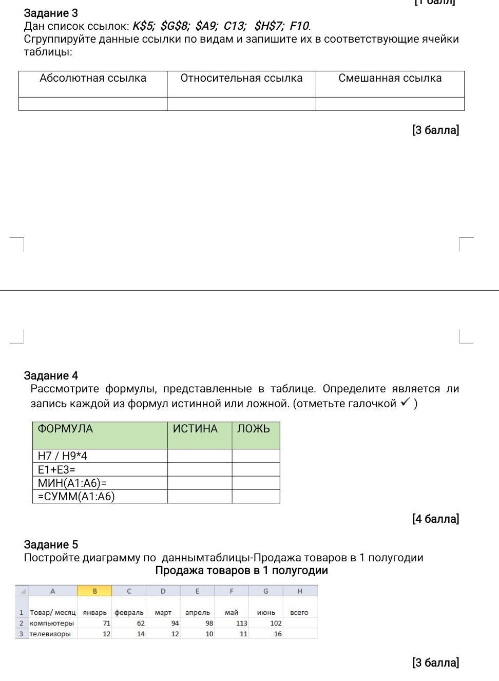 1. Абсолютная ссылка - эта та, у которой и перед номером столбца, и перед номером строки стоит значок $ - он закрепляет этот номер при копировании формулы. Смешанная - та, у которой стоит только перед строкой или только перед столбцом. Относительная же - без прикрепления к конкретному номеру вовсе.