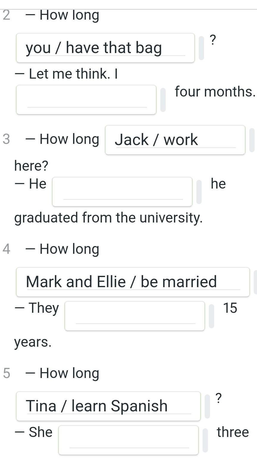 2 have you had that bag, have had it for... 3 has Jack worked / has Jack been working, has worked here since / has been working here since... 4 have they been married, have been married for... 5 has Tina been learning, has been learning for...