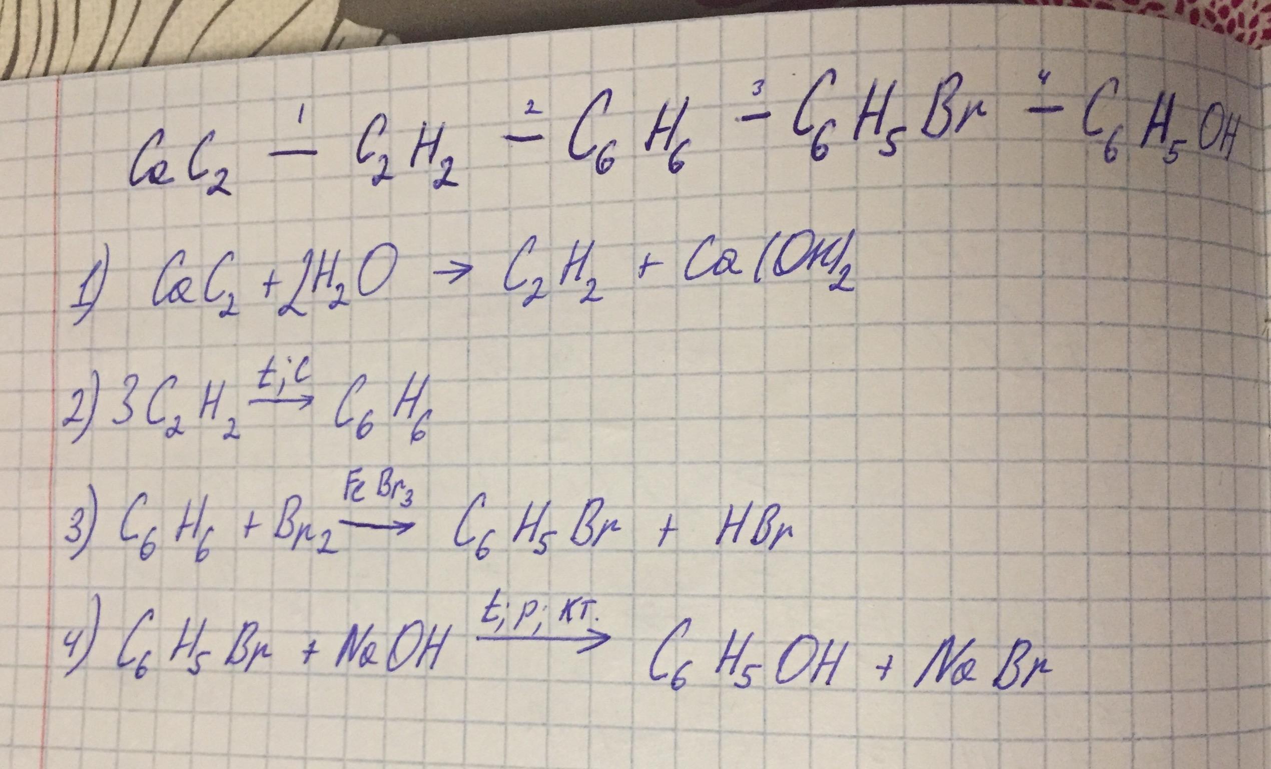Карбид кальция → этилен → бензол → бромбензол → фенол