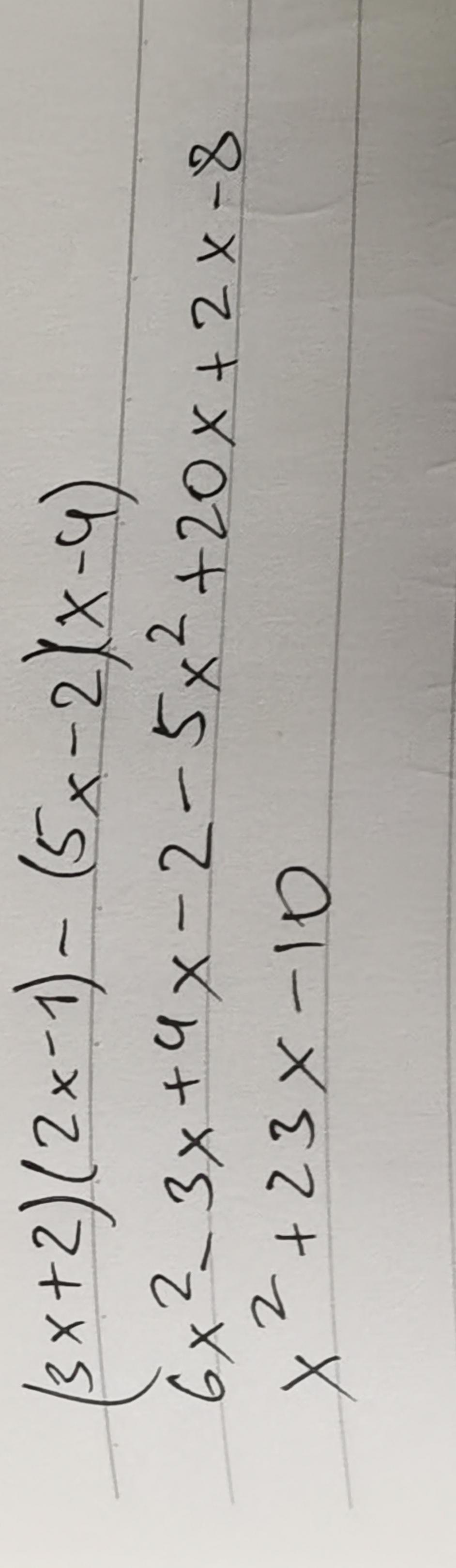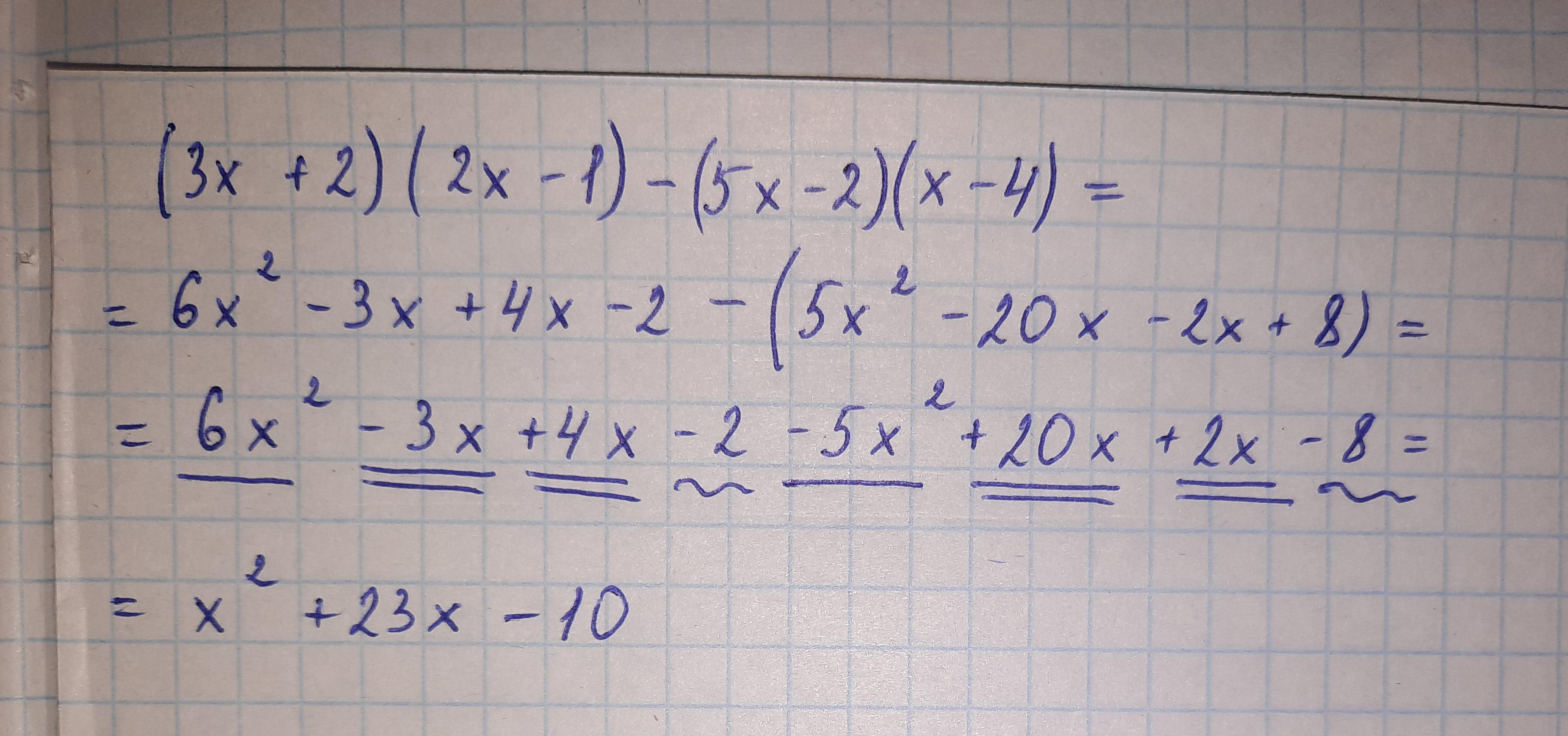 4. Спростіть вираз (3х + 2) (2x – 1) - (5x — 2) (x — 4).