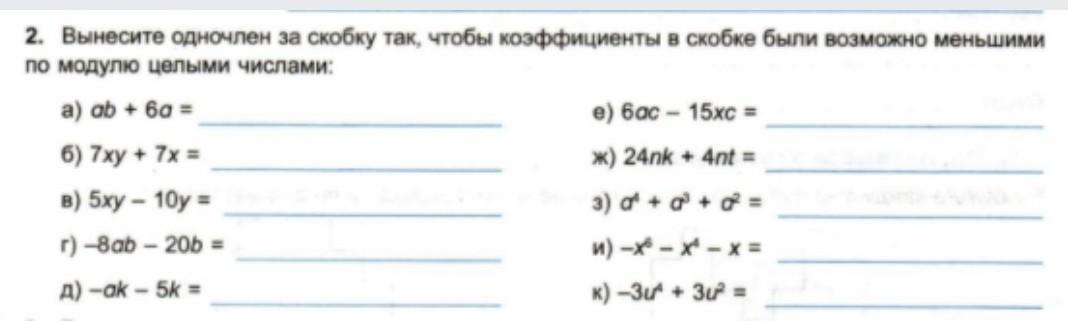 вынести одночлен за скобку так чтобы коэффиценты в скобке были возможно меньшими по модолю целыми числами ab+6a,сверху фотка есть. Заранее спасибо.Пожалуйста помогите.