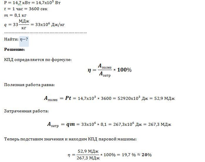 Паровая машина мощностью 14,7 кВт потребляет за 1 час работы 8,1 кг угля с удельной терлотой сгорания 33МДж/кг.Найдите КПД паровой машины