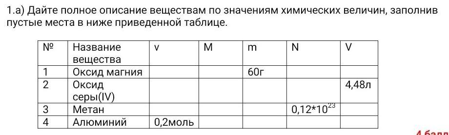дайте полное описание веществам по значениям химических величин заполнив пустые места в ниже приведенной таблице