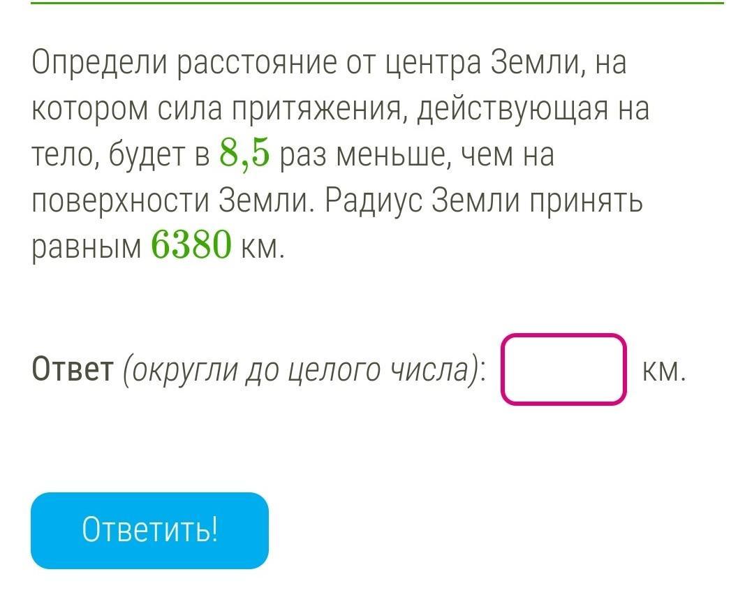 Определи расстояние от центра Земли, на котором сила притяжения, действующая на тело, будет в 8,5 раз меньше, чем на поверхности Земли. Радиус Земли принять равным 6380 км.