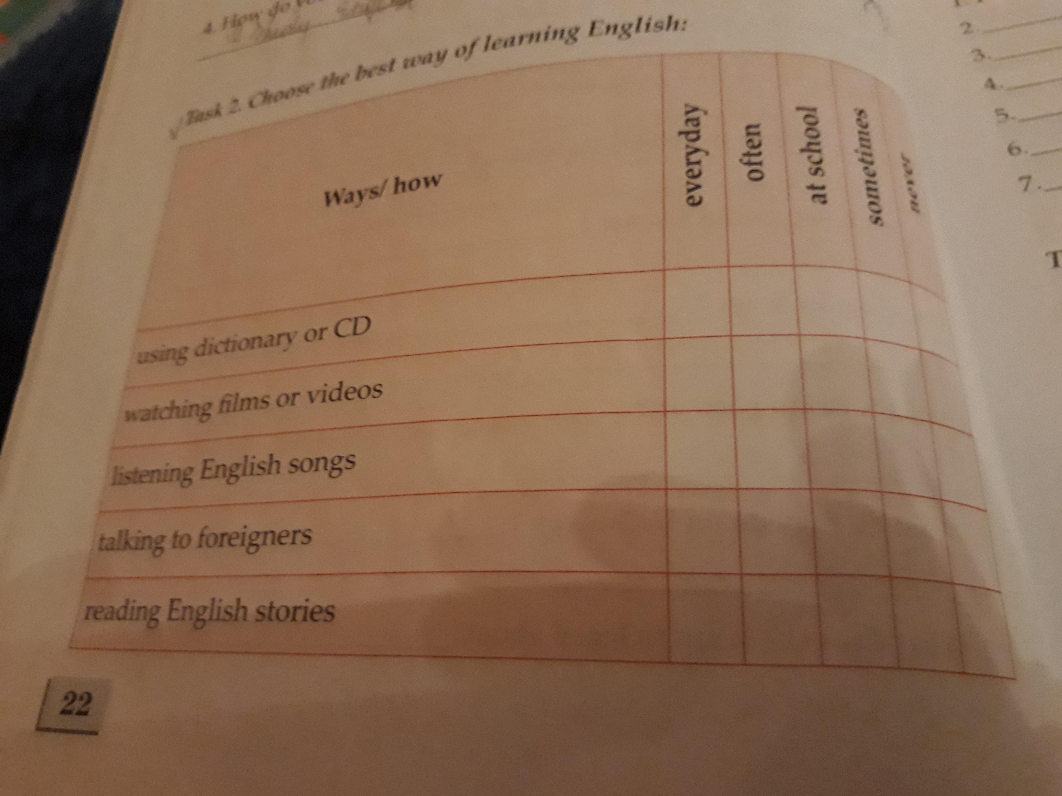 Например, первое это using dictionary or CD (использовать словари или CD диски), сверху написано everyday, often, at shool, sometimes, never (ежедневно, часто, в школе, иногда, никогда) и нужно отметить крестиком или галочкой что является правильным ответом как тебе кажется.