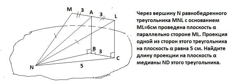 Через вершину N равнобедренного Δ MNL с основанием ML=6см проведена плоскость α параллельно стороне ML. Проекция одной из сторон этого треугольника на плоскость α равна 5 см. Найдите длину проекции на плоскость α медианы ND этого треугольника.