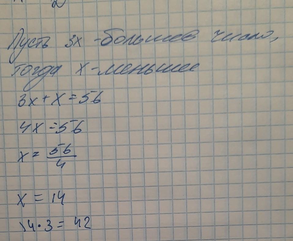 Сумма двух чисел равна 56, причём одно число в 3 раза меньше другого. Чему равно большее из чисел? ( реши задачу по схеме целое-часть)Требуется ответ. Один вариант.