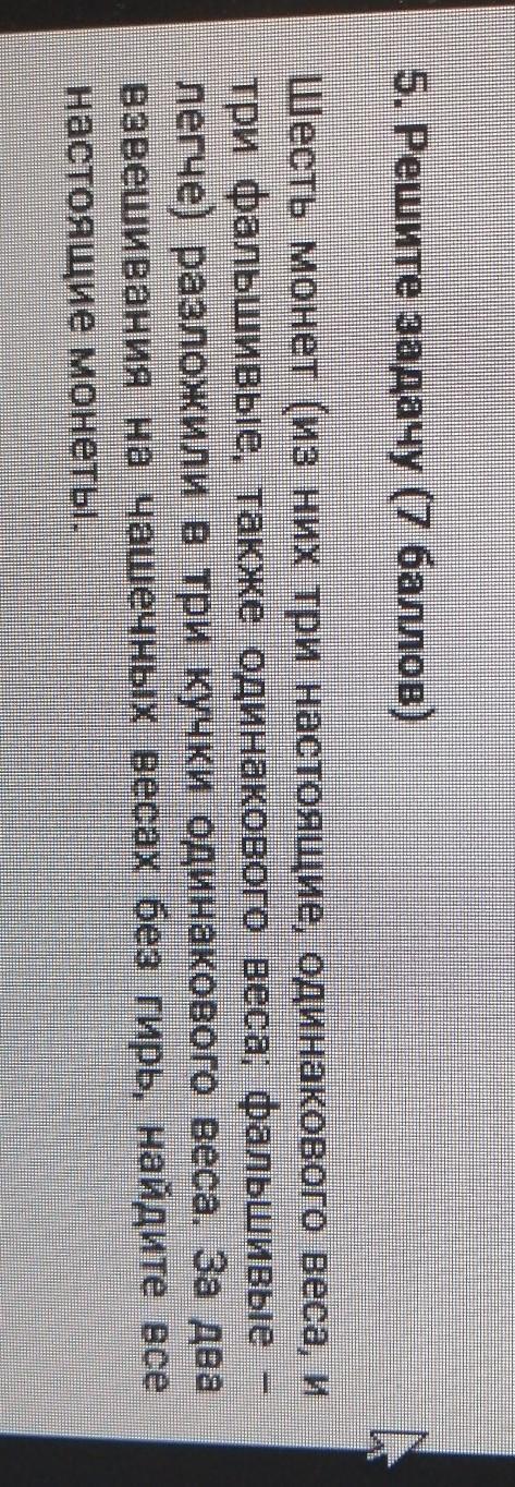 2-е взвешивание: Из тяжелой кучи взвешиваем по 1 монете. Если монеты равны то они настоящие. Если одна из монет легче, то она фальшивая. Две остальных -настоящие!