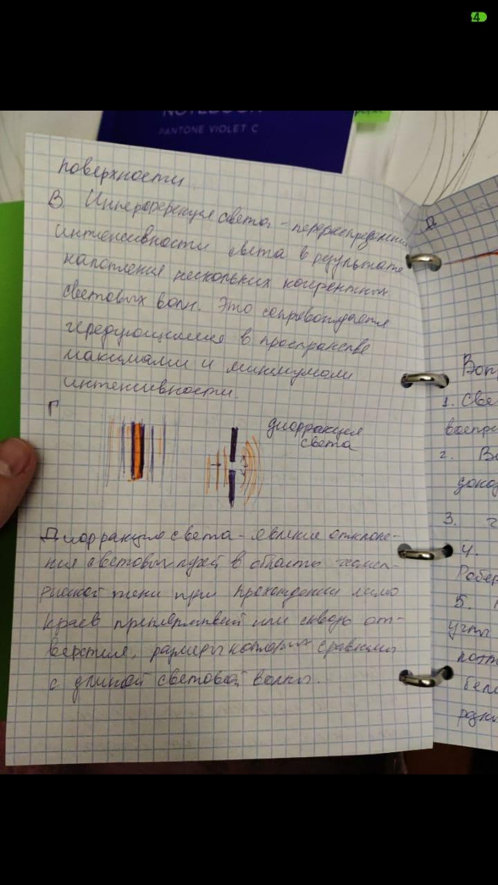Дифракция света- явление отклонения световых лучей в область геометрической тени при прохождении мимо краев ... или сквозь отверстия размеры которых сравнимы с длиной световой волны.