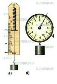сила тяжести вниз приложена к телу в центре, реакция динамомометра вверх на крючке