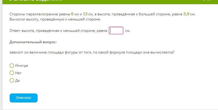 Площадь параллелограмма равна произведению стороны на высоту, проведённую к этой стороне. Зная, что большая сторона равна 12 см, а высота, проведённая к ней, равна 3,9 см, мы можем найти площадь: м². Это правило работает и для меньшей стороны, и благодаря этому мы можем, используя площадь, вычислить высоту, проведённую к ней: