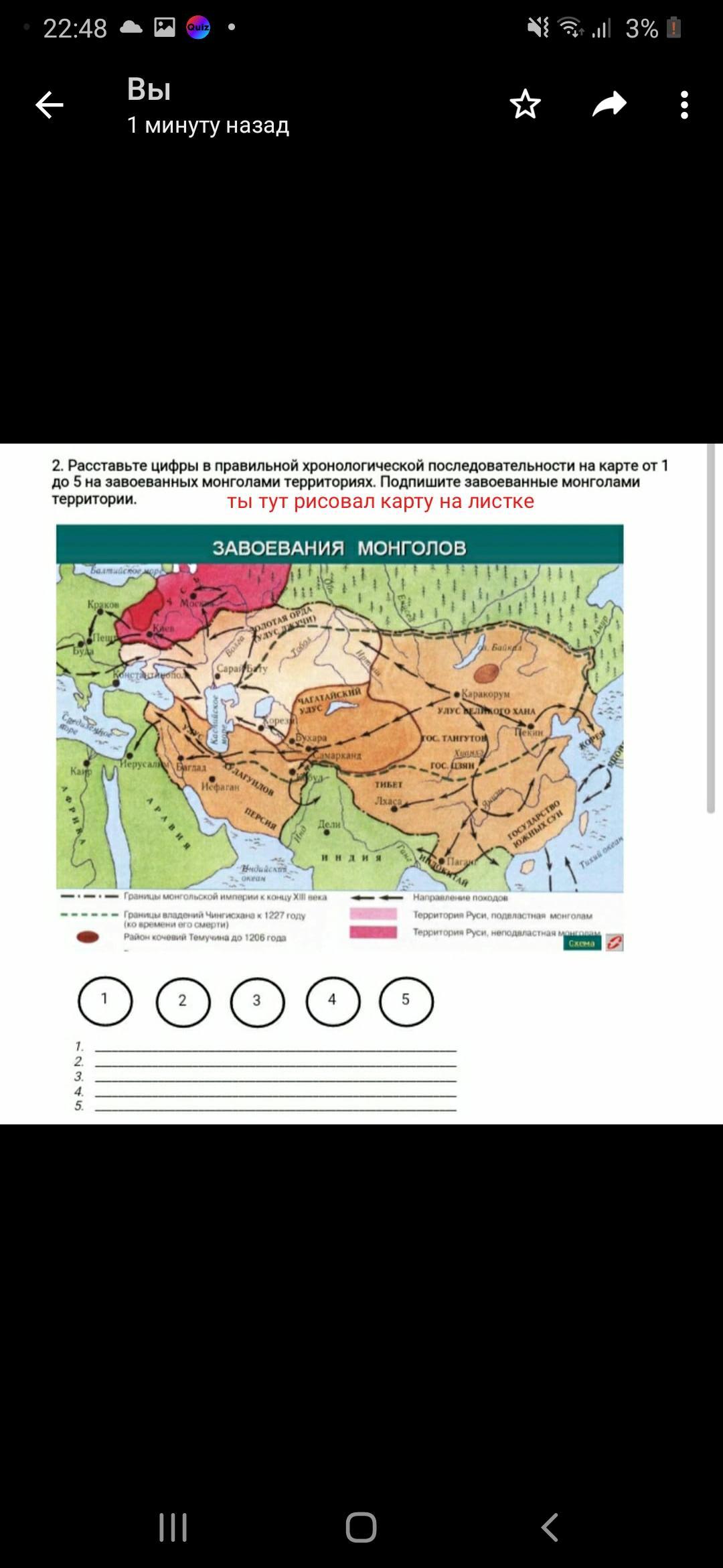 2. Расставьте цифры в правильной хронологической последовательности на карте от 1 до 5 на завоеванных монголами территориях. Подпишите завоеванные монголами территории. ЗАВОЕВАНИЯ МОНГОЛОВ