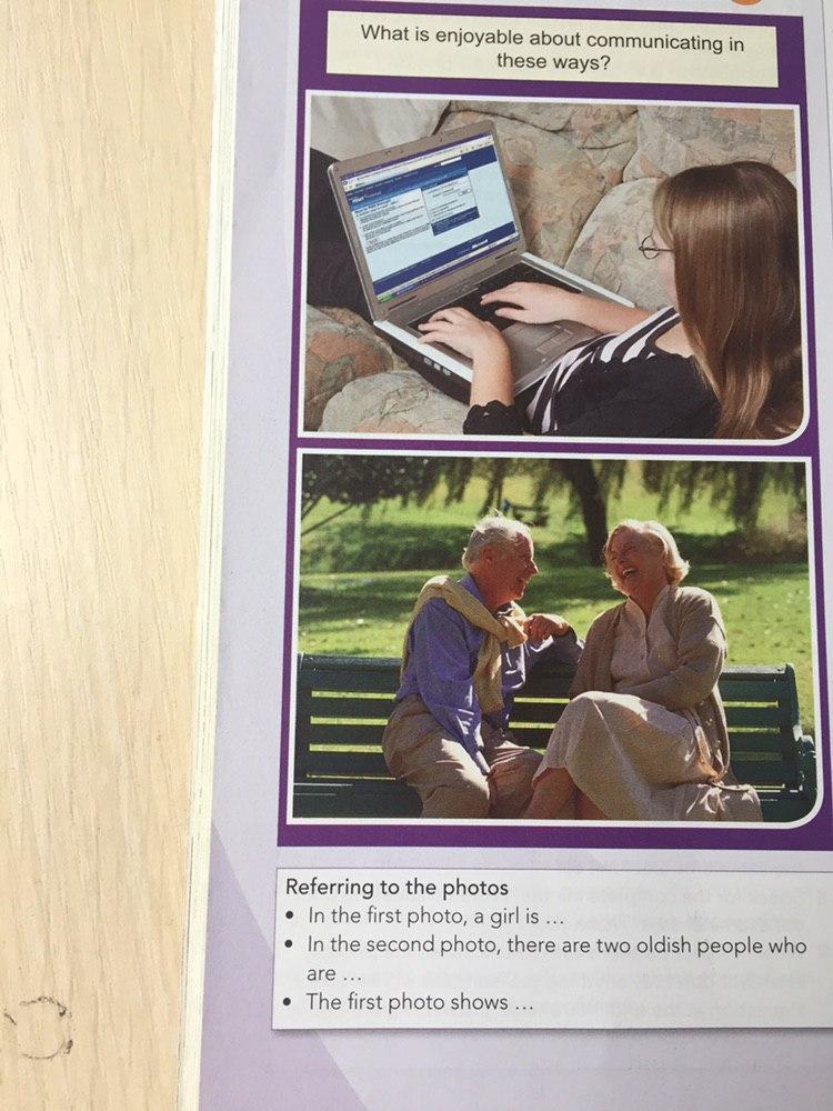 In the first photo, a girl is typing something. I guess, she writes to her friend or maybe to someone else who’s important to her. Maybe she writes email to her family member. Teenagers these days prefer to communicate through electronic gadgets. I think it is very easy and fast way to communicate. In the second photo, there are two oldish people who are enjoying their time together in very beautiful way. The are together sitting on the bench and laughing. Maybe the old man said something funny. Old people are used to meet each other in person to speak about something it is also fine because you can see the person’s face expression. First photo shows the easiest fastest and also cheapest way of communication and the second shows maybe not the most popular way to communicate but more beautiful. This is all I wanted to say.