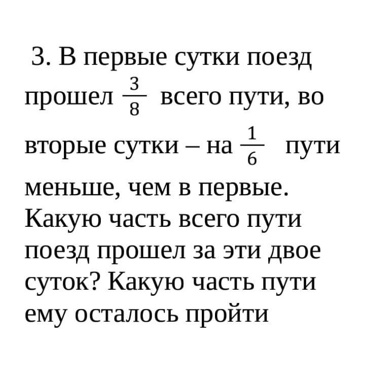 1) сначала найдем вторые сутки, для этого приводим к общему знаменателю, это 24, получается и знаменатель, и числитель умножаем на 3 (3/8) и на 4 (1/6):