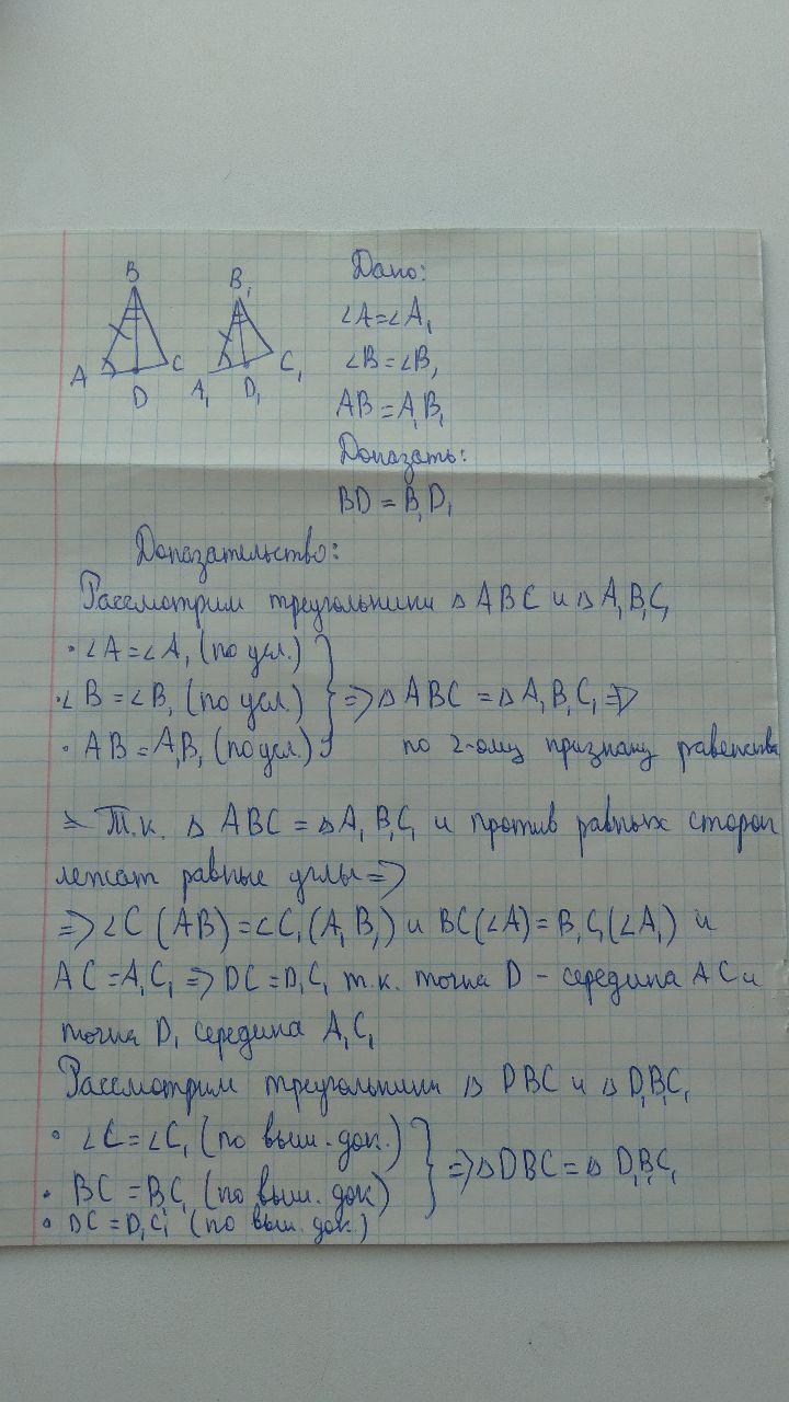 В треугольниках ABC и A,B,C угол A = углу A угол B=углу B,AB=A,B.Точки D и D середины отрезков AC и A,C соответственно.Докажите что BD=B,D