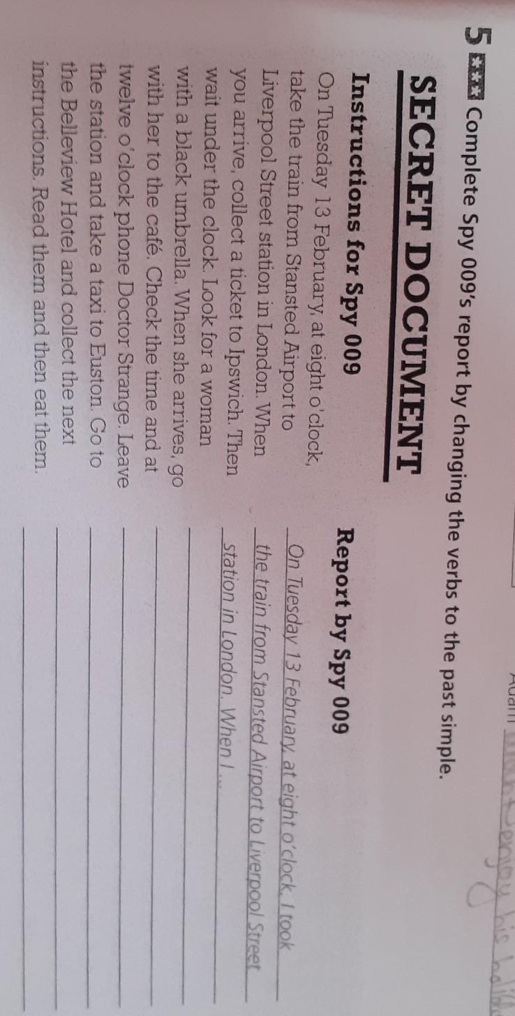 When I arrived, I collected a ticket to Ipswich. Then I waited under the clock. I looked for women with a black umbrella. When she arrived, I went with her to the cafe. I checked the time and at twelve o'clock I phoned Doctor Strange. I left the station and took a taxi to Euston. I went to Belleview Hotel and collected the next instructions. I read them and ate them.