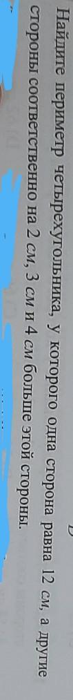 Одна сторона 12 см,вторая 12+2=14 см,третья 12+3=15 см,четвртая 12+4=16 см.Периметр-это сумма всех сторон.Р=12+14+15+16=67 см