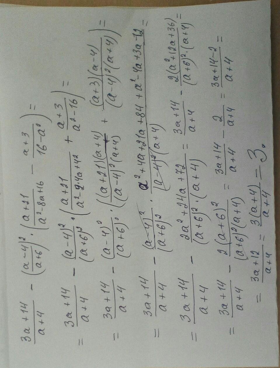 помогите срочно пожалуйста помогите пожалуйста помогите пожалуйста помогите пожалуйста помогите пожалуйста срочно!!!!!!!! Доведіть, що при всіх допустимих значеннях a значення виразу 3a+14/a+4 - (a-4/a+6)^2 × (a+21/a^2 - 8a+16 - a+3/16-a^2) не залежить від a