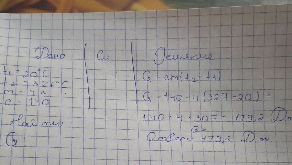 определить количество теплоты, необходимое для нагревания 4кг свинца от температуры 20° до 327°.удельная теплоемкость свинца 140дж/кг.гр