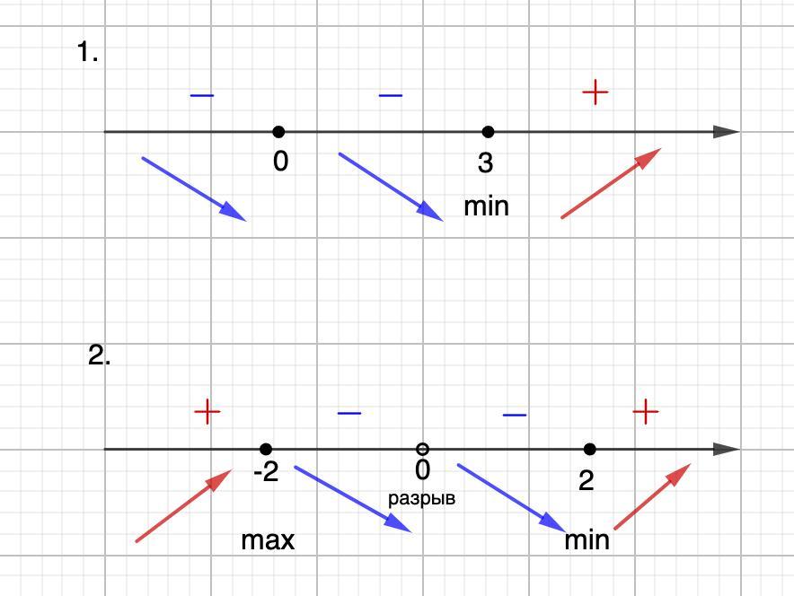 Если производная меняет знак с "+" на "-" - точка max; с "-" на "+" - точка min.