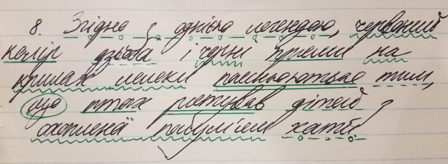 8. Згідно з (складений прийменник) однією (числівник) легендою (іменник), червоний (прикметник) колір (іменник) дзьоба (іменник) і (сполучник) чорні (прикметник) плями (іменник) на (прийменник) крилах (іменник) лелеки (іменник) пояснюються (дієслово) тим (займенник), що (сполучник) птах (іменник) рятував (дієслово) дітей (іменник) з (прийменник) охопленої (дієприкметник) полум'ям (іменник) хати (іменник).