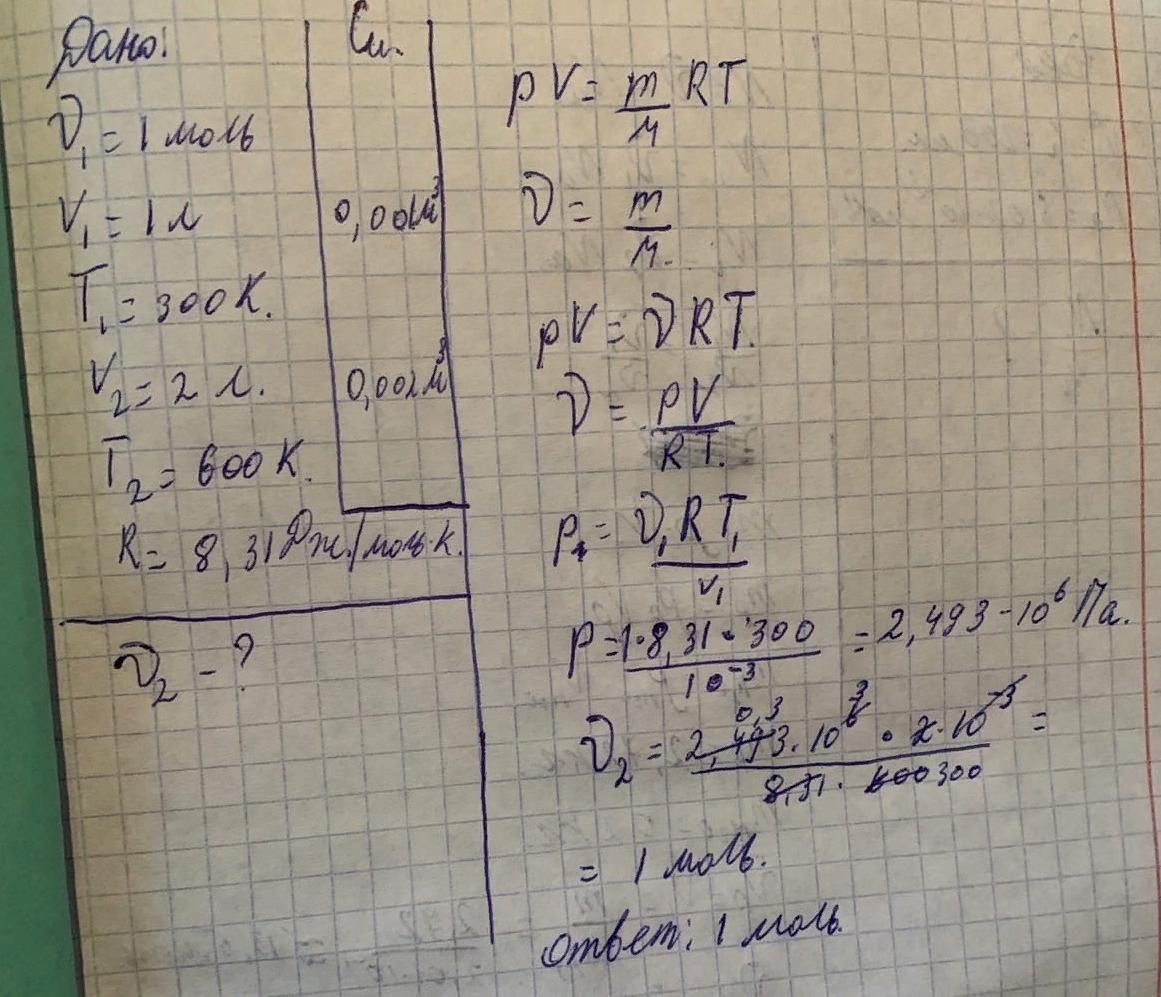 Водород количеством вещества υ= 1 моль находится в сосуде вместимостью V1=1л при температуре T1=300K. Какое количество кислорода находится в сосуде вместимостью V2= 2л при температуре T2 =600K и том же давлении? Газы считайте идеальными. (Молярная масса молекулы водорода M(H2)=2г/моль, молярная масса молекулы кислорода M(O2)=32г/моль универсальная газовая постоянная R=8,31Дж/(моль·К)