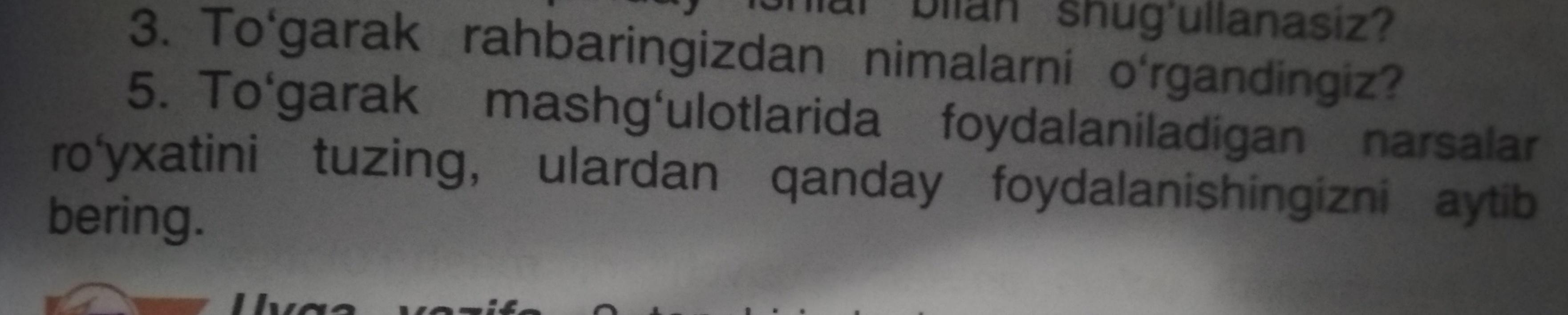 To'garak mashg'ulotlarida foydalaniladigan narsalar ro'yxatini tuzing,ulardan qanday foydalanishingizni aytin bering.