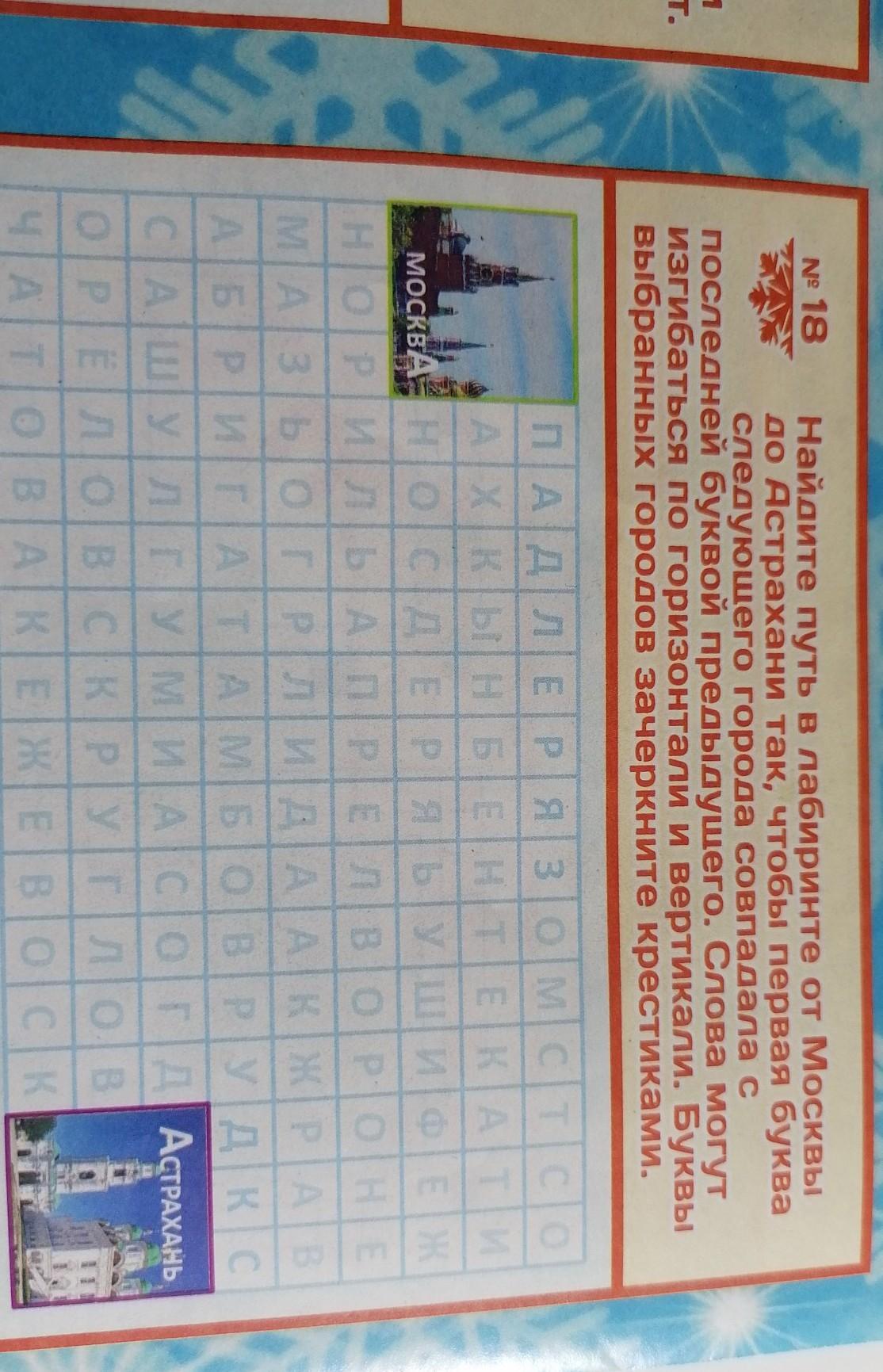 найдите путь в лабиринте от Москвы до Астрахани так чтобы первая буква следующих города совпадала с последней буквой предыдущего слова слова могут развиваться по горизонтали и вертикали буквы выбранных городов зачеркните крестиками