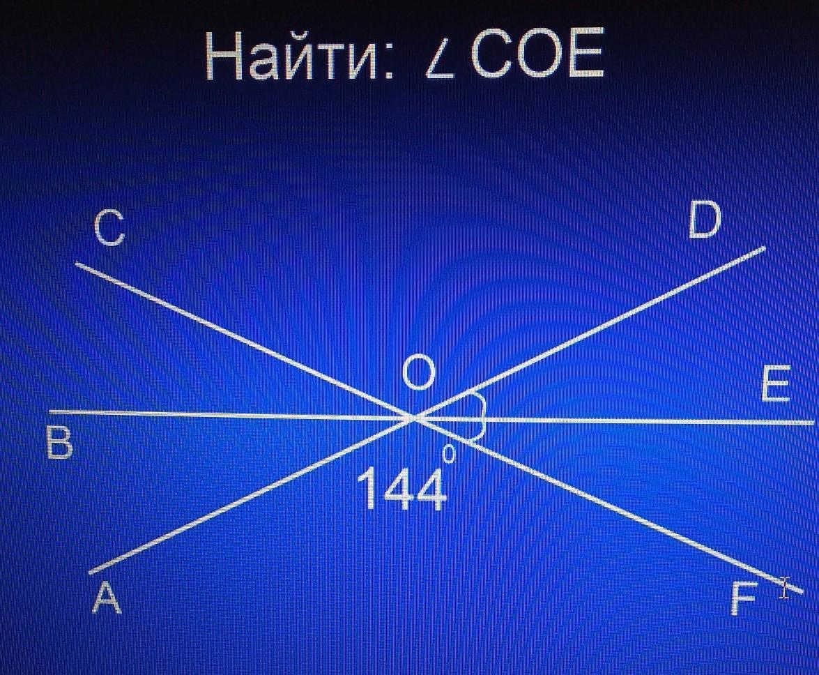 180 - 144 = 36° = ∠BOA + ∠EOF