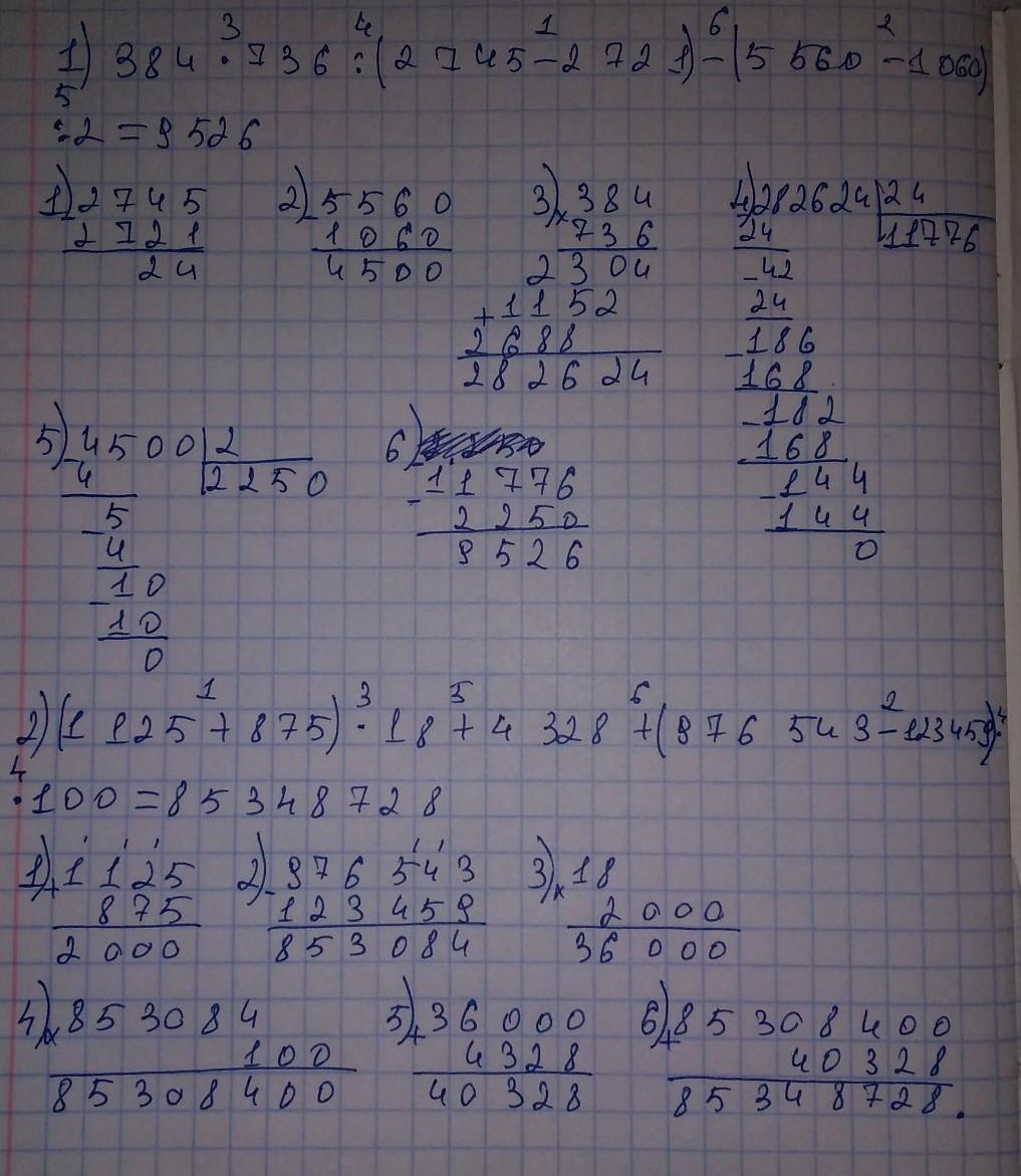 384 *736 : (2 745 - 2721) - (5 560 - 1 060) :2=