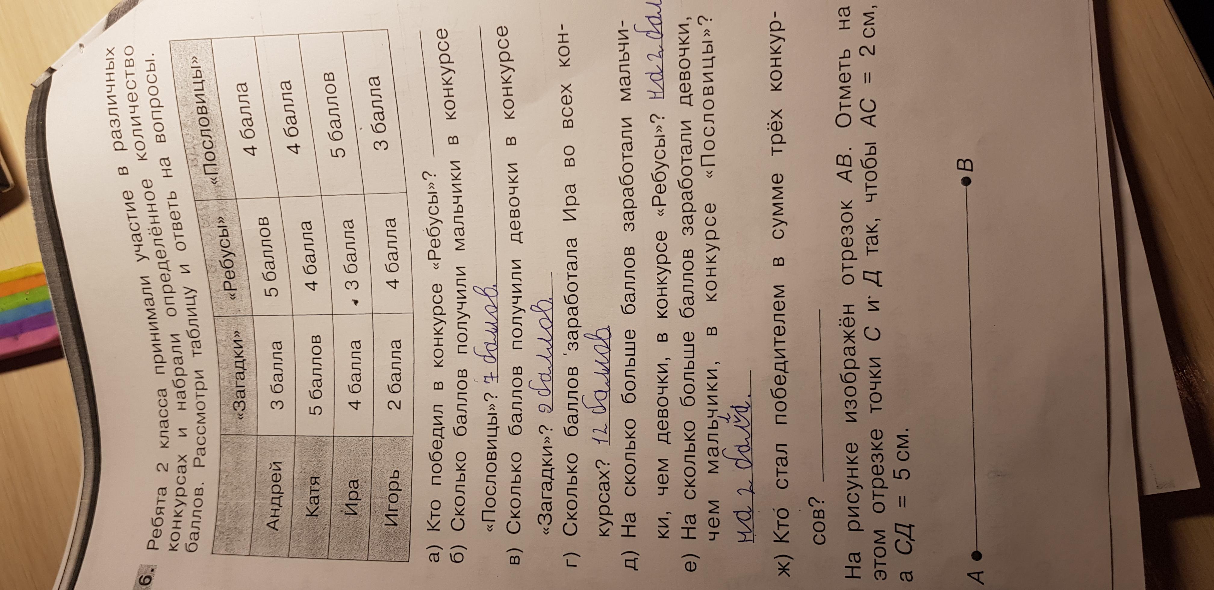 Андрей за конкурс "ребусы" заработал 5 баллов, что является самым лучшим из результатов. Но больше всех баллов по итогам 3х конкурсов и Кати