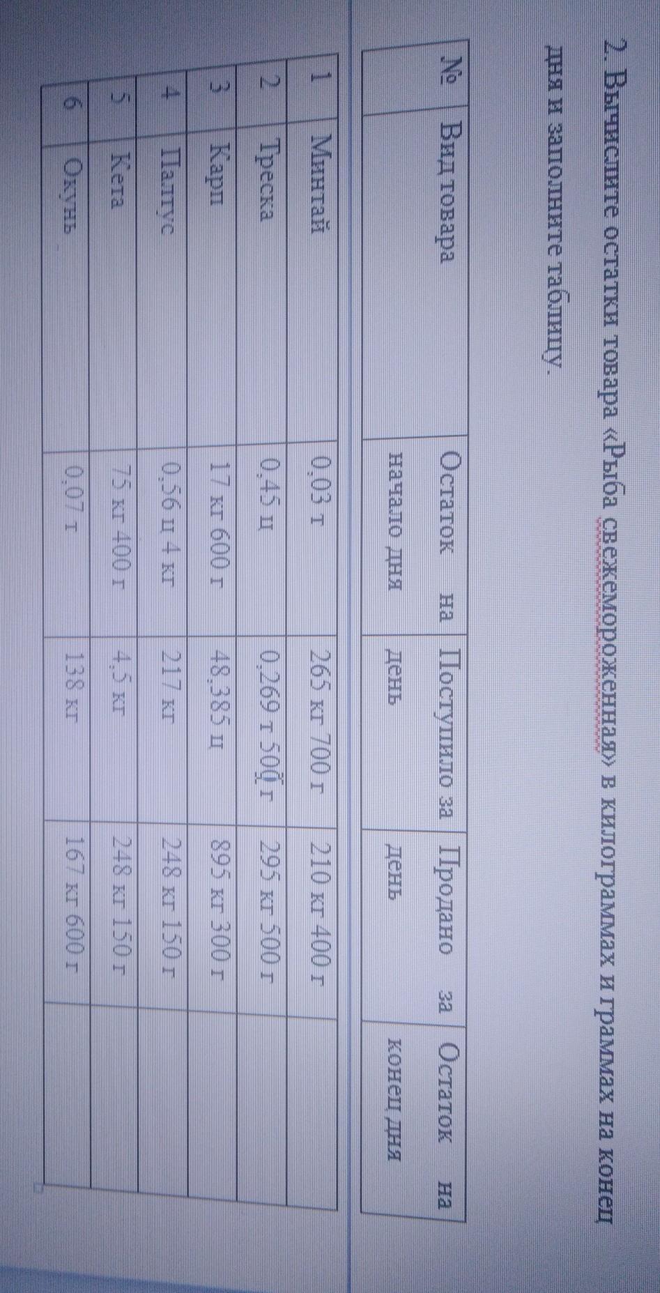 2. Вычислите остатки товара «Рыба свежемороженная» в килограммах играммах на конец