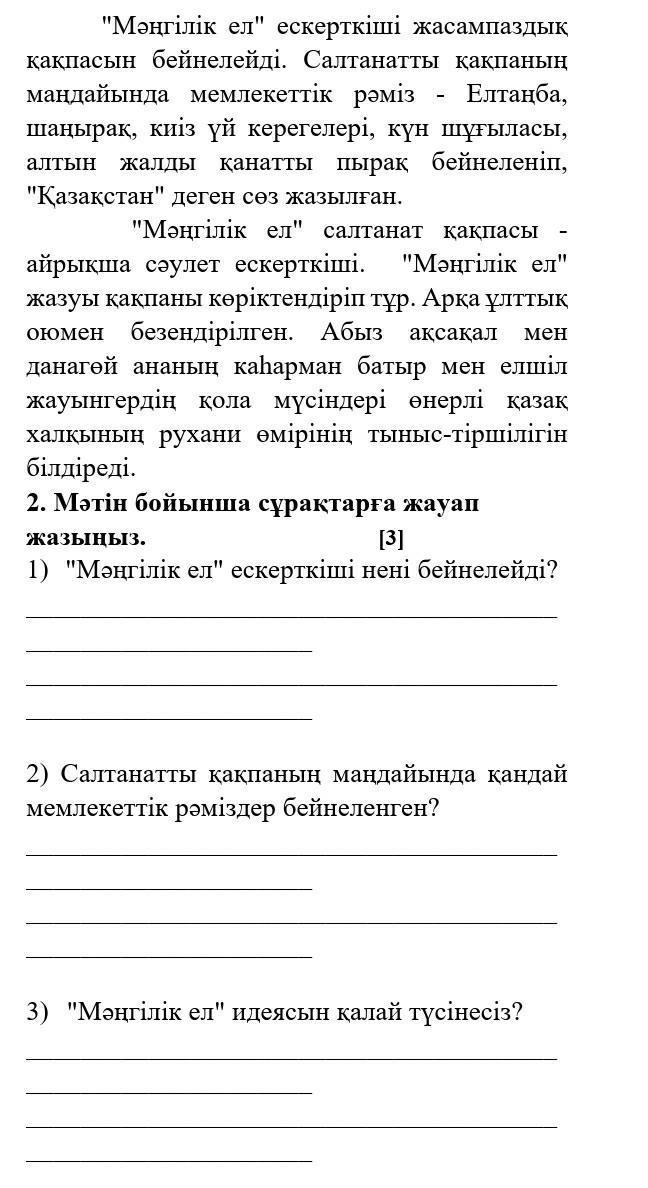 2 сұраққа жауап: Салтанатты қақпаның маңдайында мемлекеттік рәміз Елтаңба бейнеленген. Елтаңбада шаңырақ, киіз үй керегелері, күн шұғыласы, алтын жалды қанантты шырақ бейнеленген.