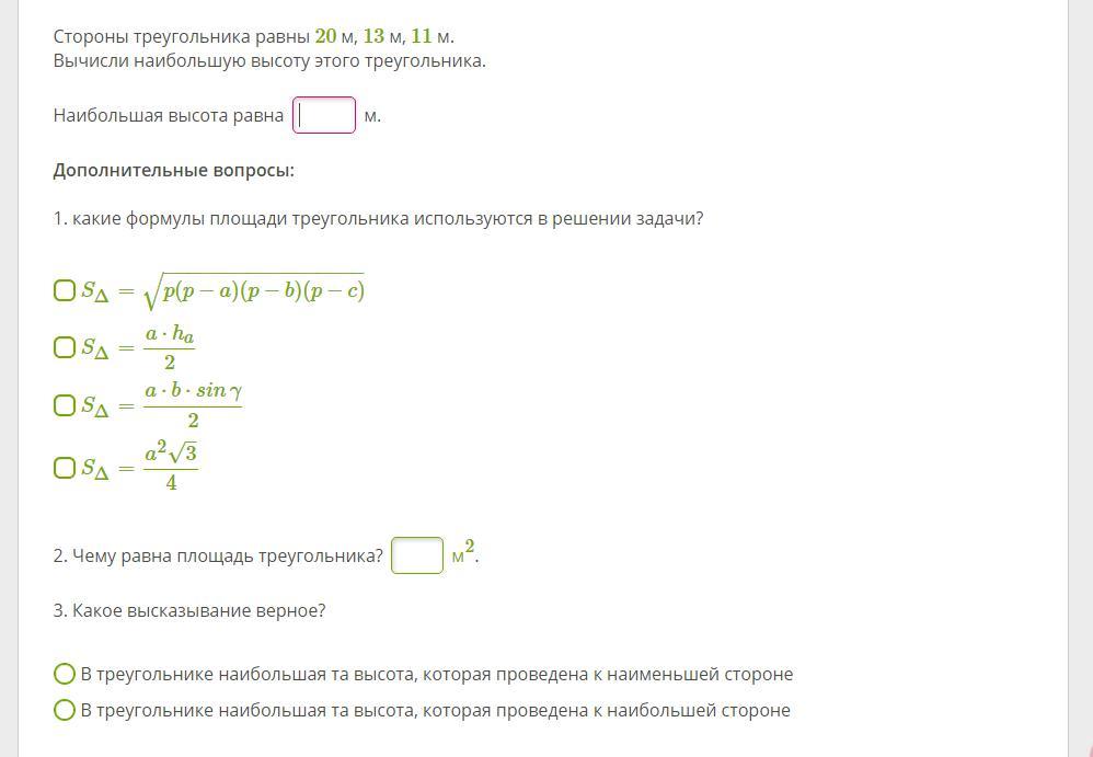 3. Наибольшая та высота, которая проведена к наименьшей стороне