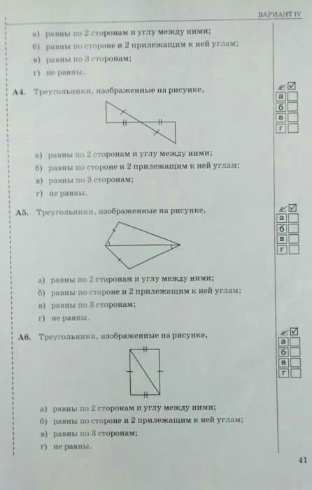 А4 равны по 2 сторонам и углу между ними. 1 правило равенства треугольников. А5 не равны, во всяком случае глядя на предоставленные сведения) А6 равны по трем сторонам, 3 правило равенства треугольников.