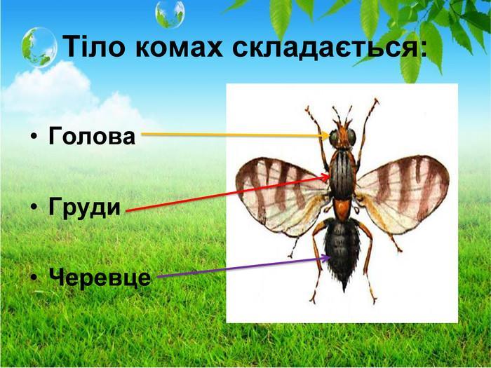 Тіло комах розділене на три відділи: голову, груди та черевце.