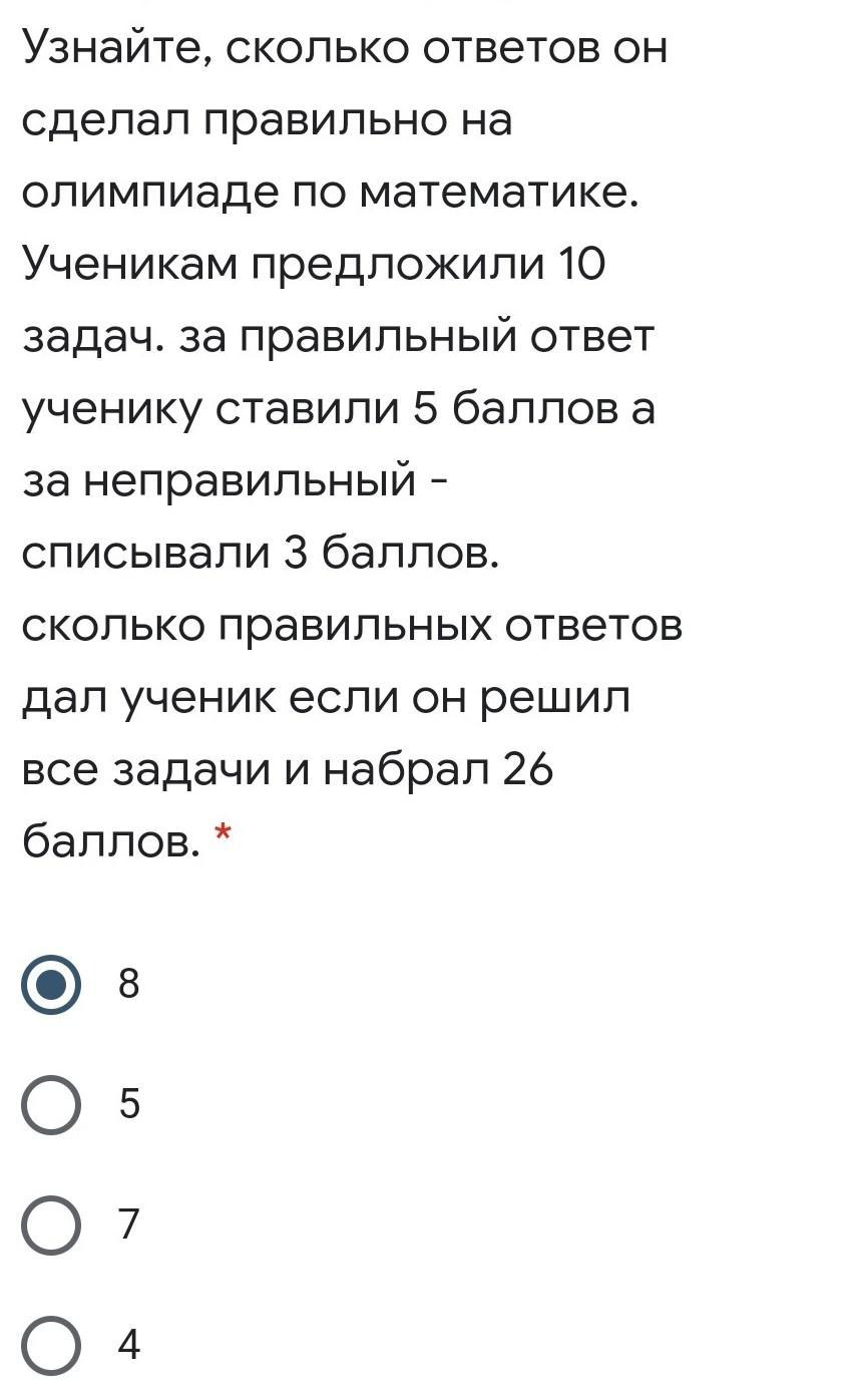 Ответ: 7. 7×5=35 ( правильных). 3×3=9 (неправильных). В результате 35-9=26 баллов