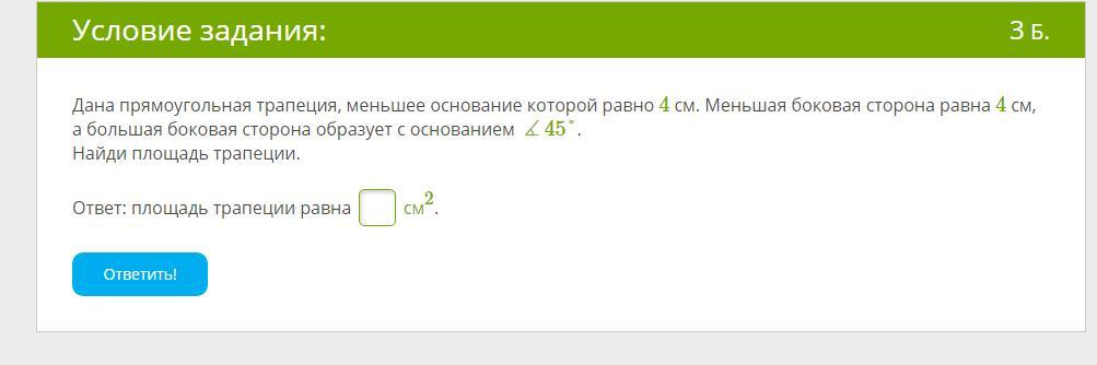 Объяснение:Трапецию разбиваем на квадрат 4х4 и узнаем его площадь (16 см²). А оставшаяся часть будет равна 1/2 площади квадрата, то есть 8 см². Суммируем, получается 24 см²