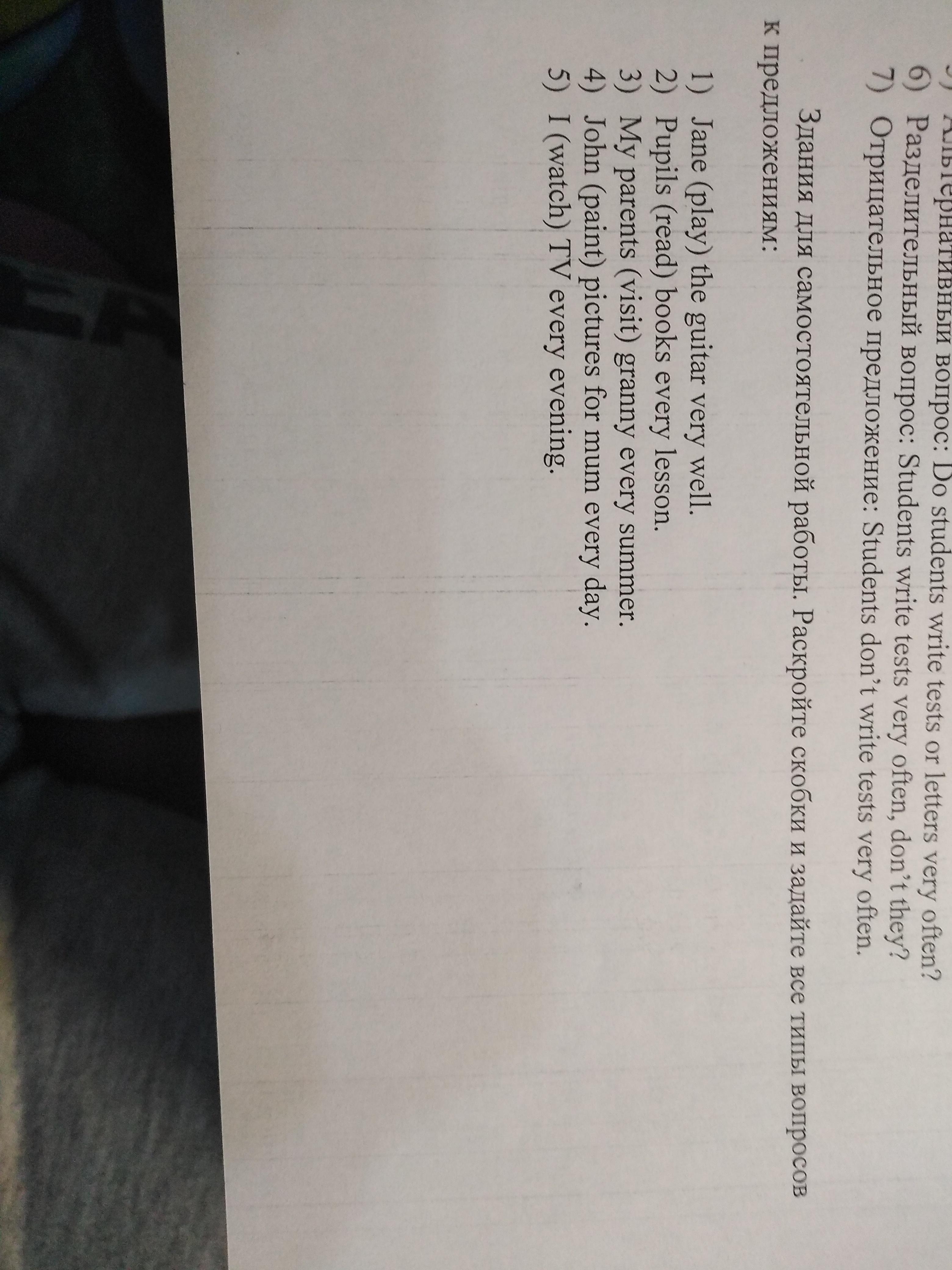 Задание по самостоятельной. Раскрой те скобки и задайте все типы вопросов к предложениям. Помогите пожалуйста срочно