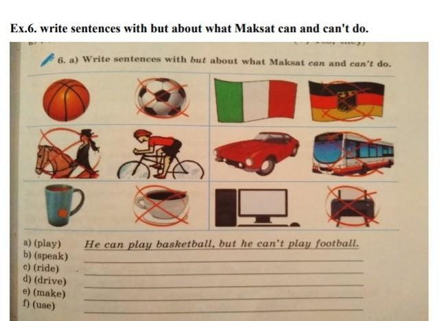 ну блин пж помогите у меня 12 часов ночи 5 раз прошу write sentences with but about what Maksat can and can't