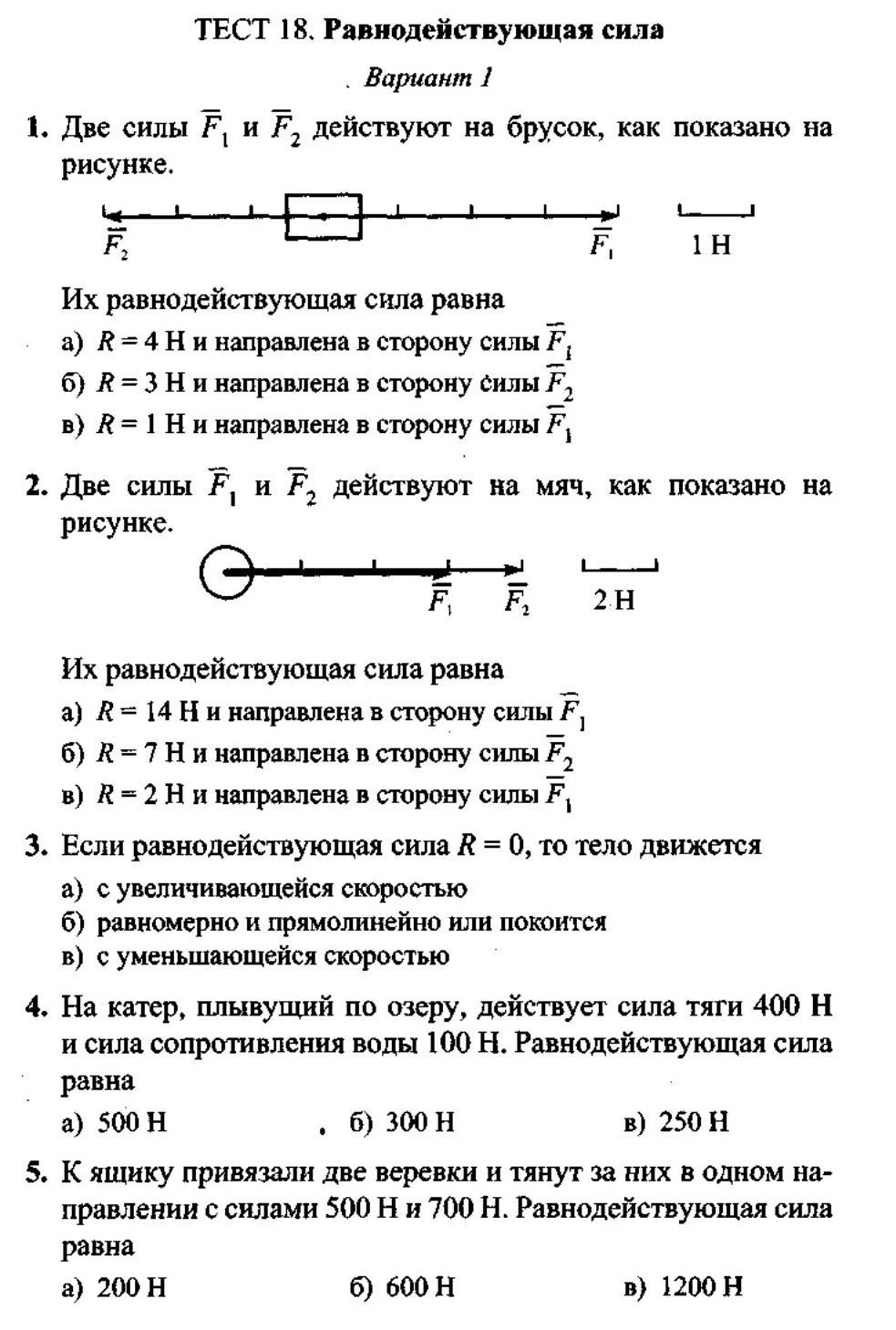 мне кажется в 1 номере ответ в) так как из большего надо вычесть меньшее, то есть из F1 - F2 и получаем 1H. Во 2 ответ а) тут надо сложить уже F1+F2 получили 14Н. В 3 ответ б) я думаю тут всё понятно. В 4 ответ б) из большего вычесть меньшее. В 5 ответ в) ну и тут складываем F1+F2