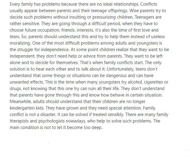 Emily: One of the most difficult problems among adults and youngster is the struggle for independence. At some point children realize that they want to be independent, they don't need help or advice from parents. That's when conflicts start. The only solution is to hear each other and to talk about it.