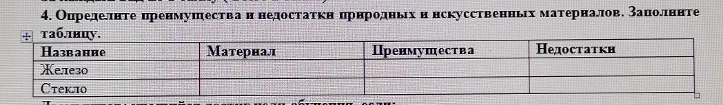 железо: материал - металл; преимущества - прочность, твердость при сохранении упругости,лёгкость механической обработки; недостатки - металл тяжёлый, из-за чего утяжеляет, например, объект строительства, так же способно накапливаеть электричество
