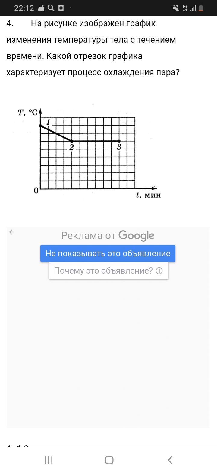 На рисунке изображен график изменения температуры тела с течением времени. Какой отрезок графика характеризует процесс охлаждения пара?