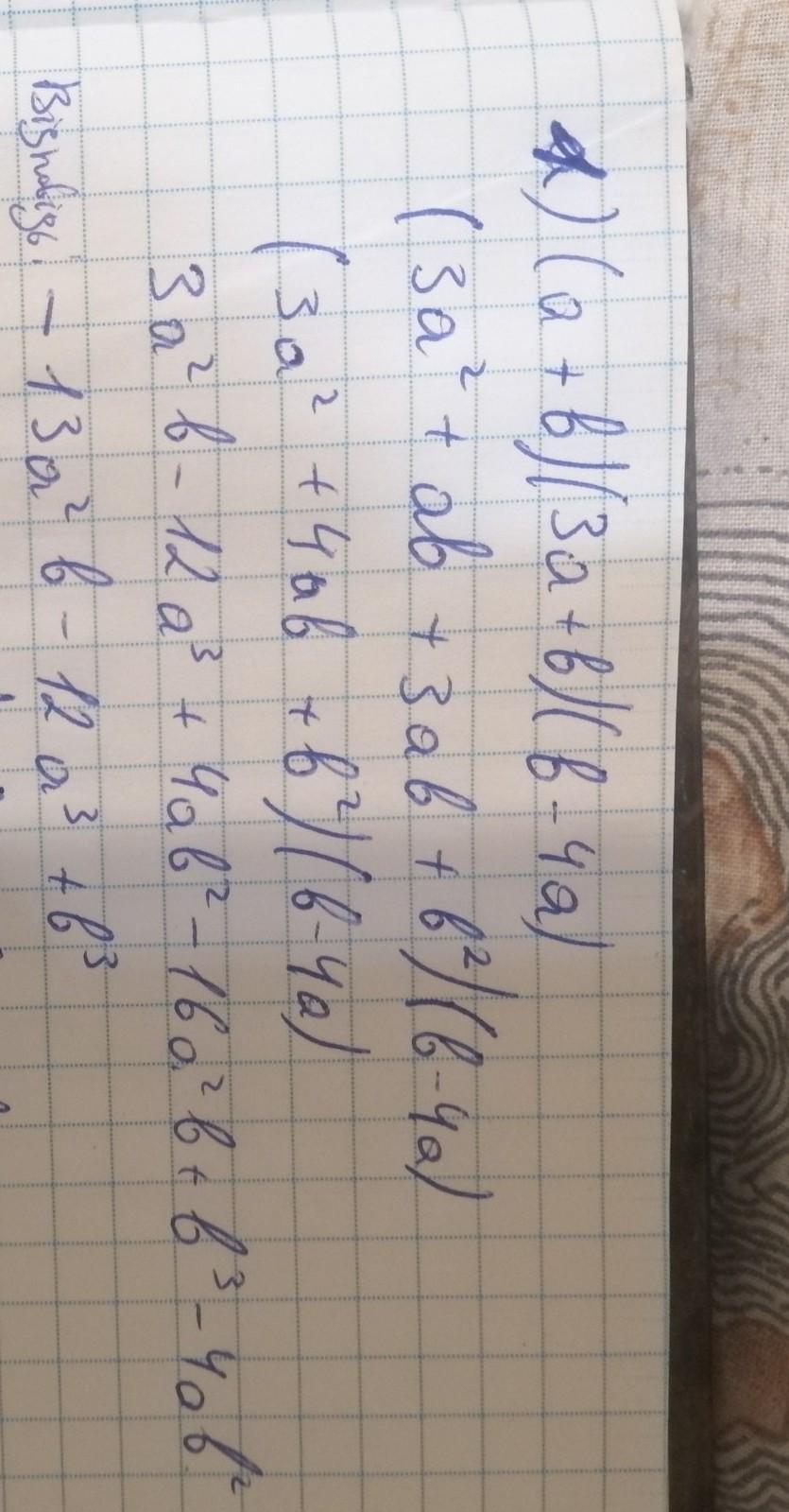 1. (3a²+ab+3ab+b²)(b-4a)=(3a²+ab+b²)(b-4a)=3a²b-12a³+ab²-4a²b+b³-4ab²=-12a³+b³-a²b-3ab²