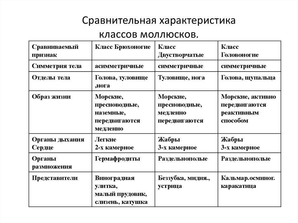 составить таблицу сравнительная характеристика классов моллюсков : 1. Форма раковины 2. голова и головные придатки 3. форма ноги 4. органы дыхания 5. сердце 6. нервная система 7. способ питания.