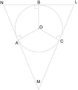 На рисунке OC будет образовывать прямой угол с ML, так как радиус окружности, проведенный к касательной линии, будет перпендикулярен к самой касательной