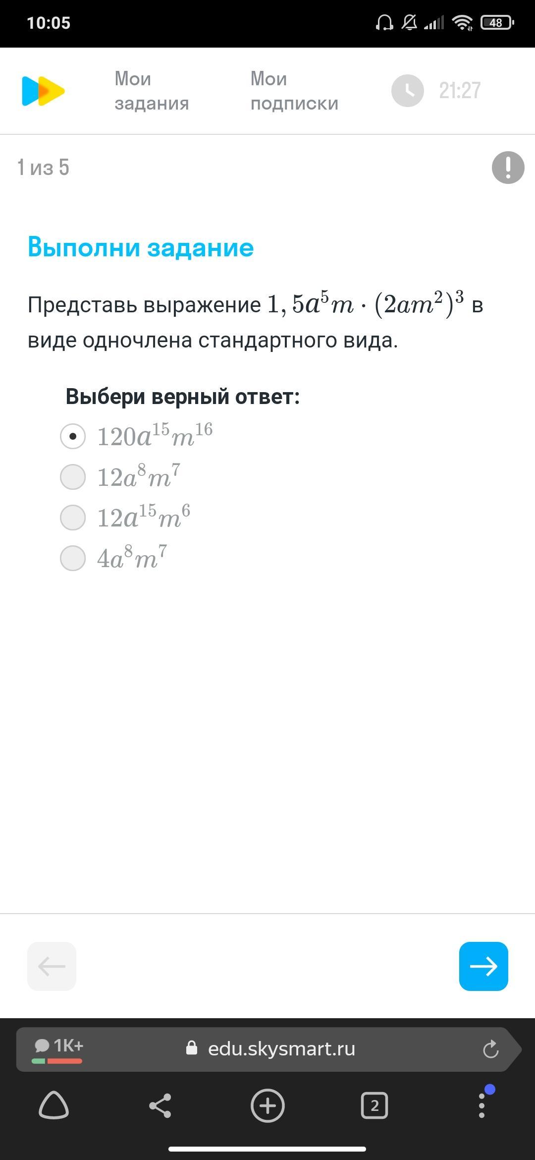 1,5a^5m•2^3•a^3•m^6 = 12a^8m^7 (ответ 2)
